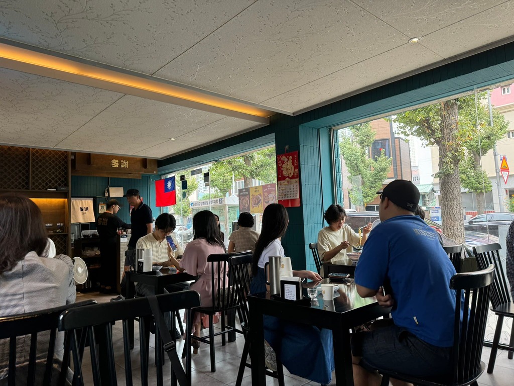 看到這家「多謝」台灣料理門口,排著一排候位的椅子,餐廳門口也有現場候位機。平日中午大概等了10多分鐘才有位子。釜山人對台灣料理的支持,讓人由衷的感謝