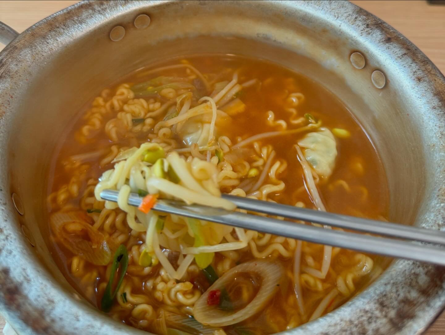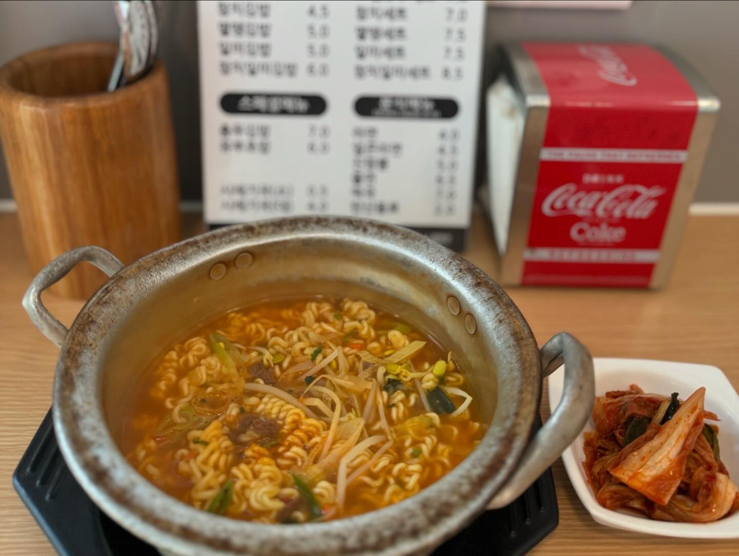 往釜山近代歷史館的路上,在巷弄間發現了一家用泡面鍋煮泡面+紫菜飯捲的店