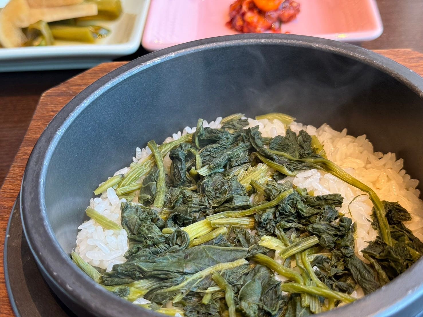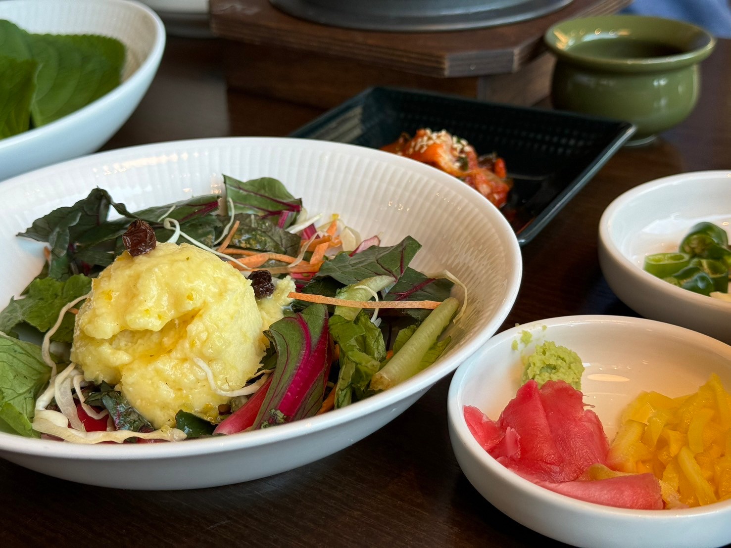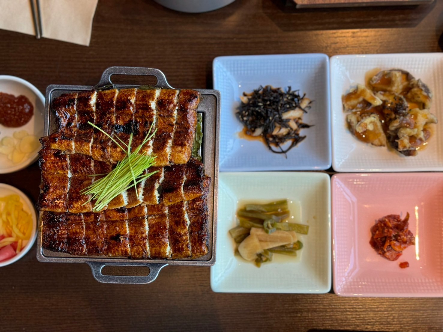 烤鰻的韓式吃法,就是把烤鰻魚沾醬放在蔬菜上包起來吃。(就像包烤肉一樣),菜飯挖放在另外一個大碗中,原鍋倒入熱水悶燒成鍋巴湯飯,留到最後食用(夫家吃法) 搭配小菜特別清淡爽口。