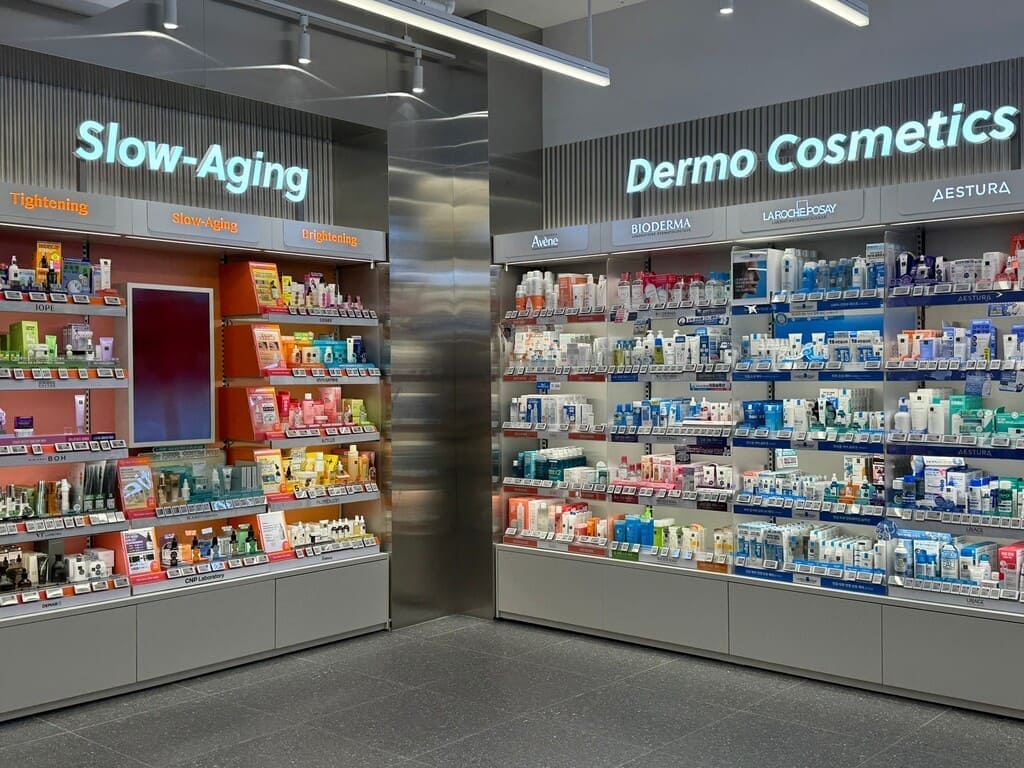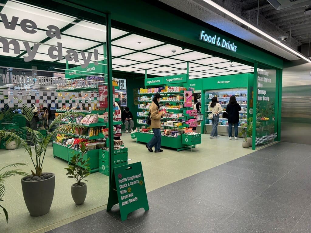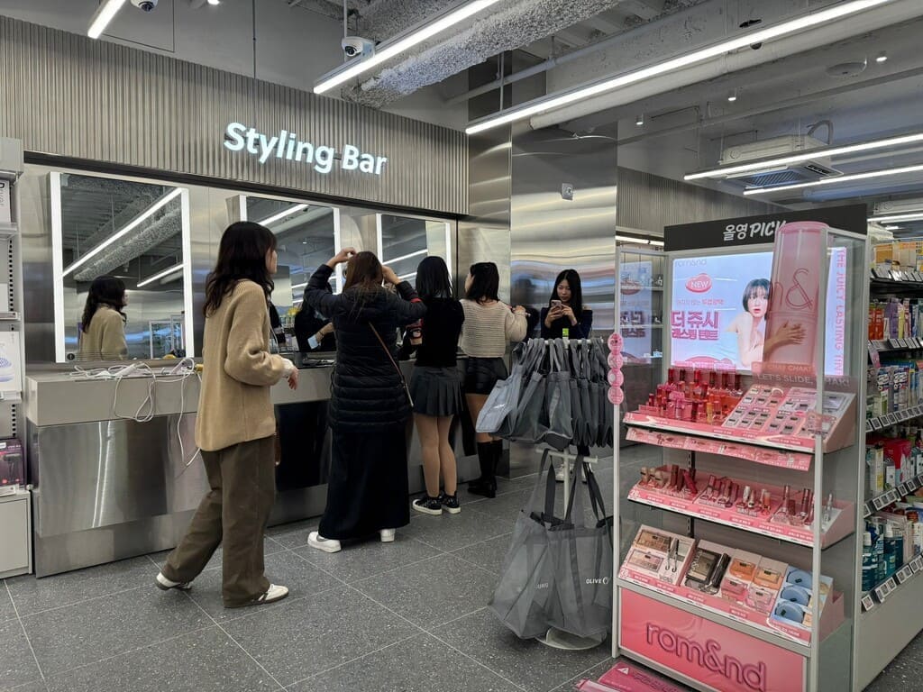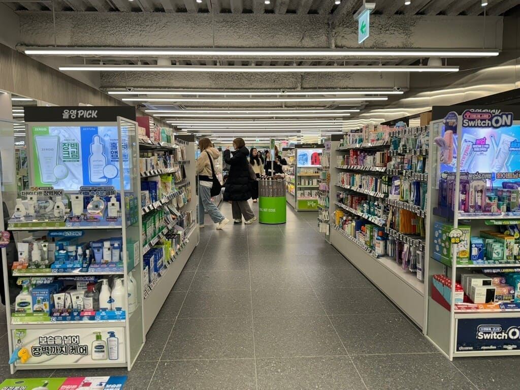 我們在西面公車站,發現對面這一家 Olive Young,忍不住想去找找捲髮精華。一進門,就覺得這家店的空間設計很棒,而且工作人員的英文也很好👍
