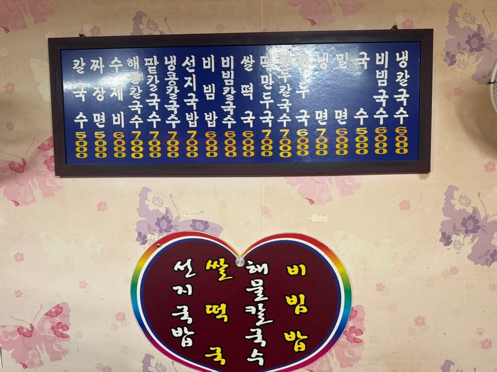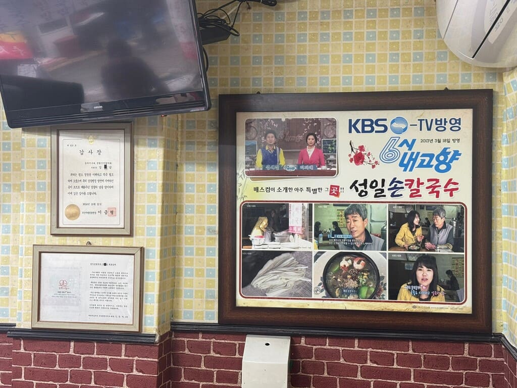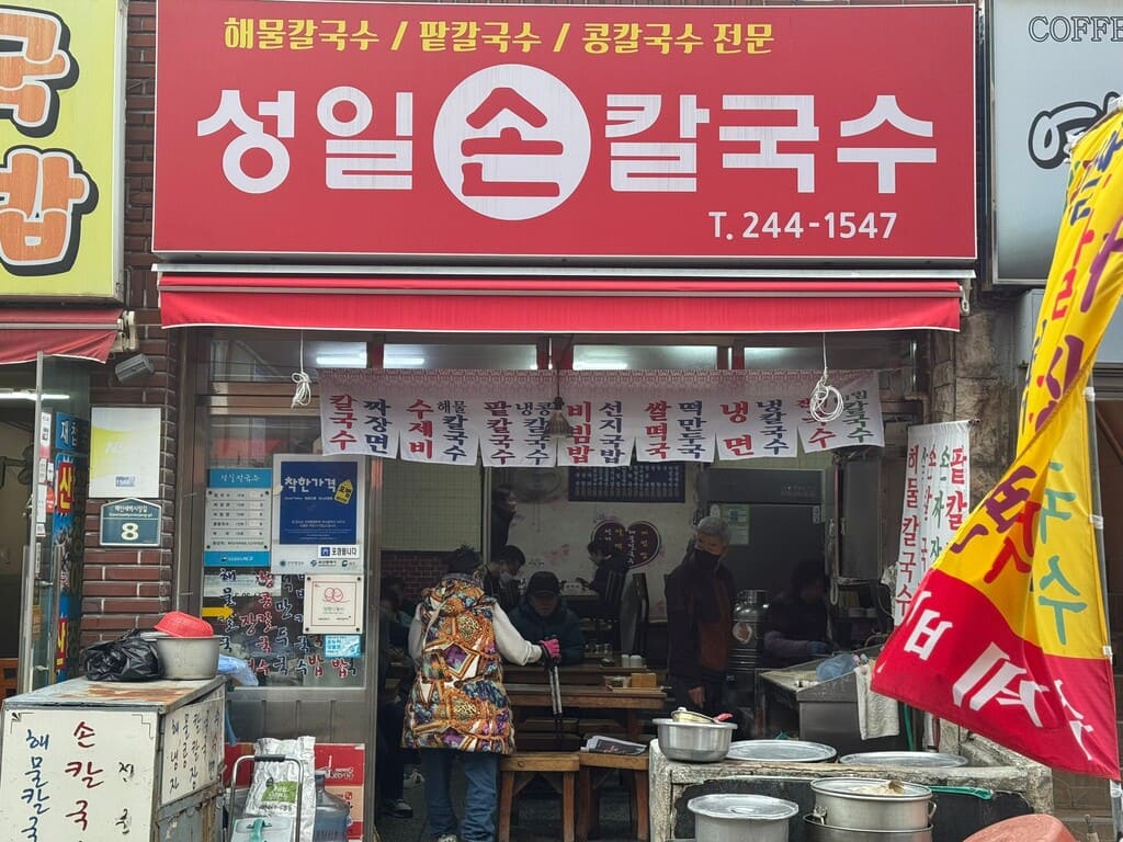 Seongil 手工刀切面,湯頭很清,麵條Q彈。 我喜歡紅紅辣醬,帶有一點鹹的味道(其實這個辣醬一點也不辣)。 價格非常親民,而且他們家的麵條有很多不同的煮法,也有我喜歡的麵疙瘩。