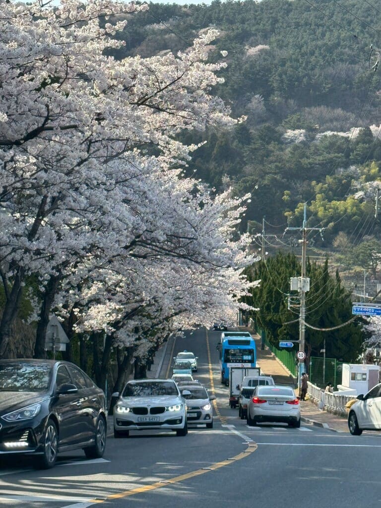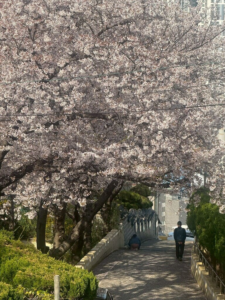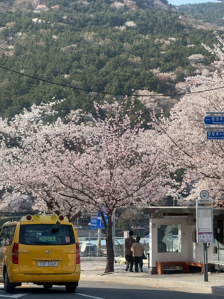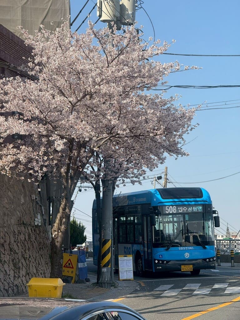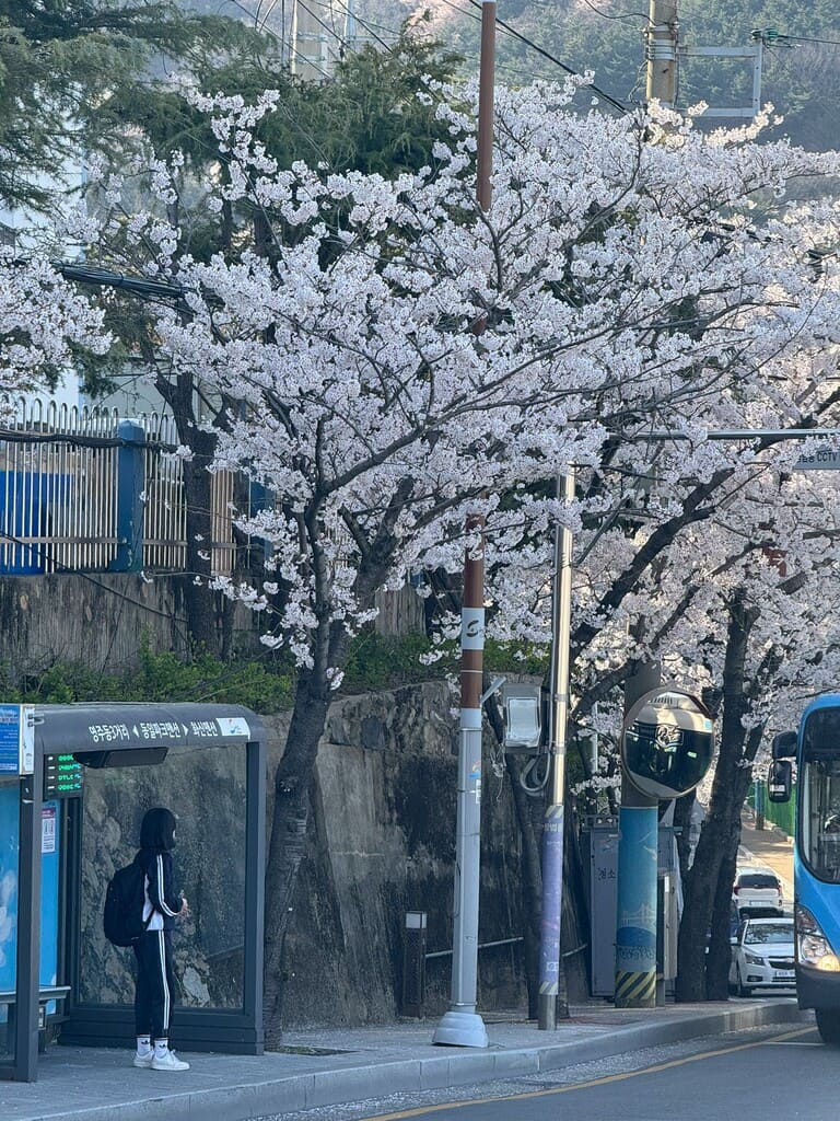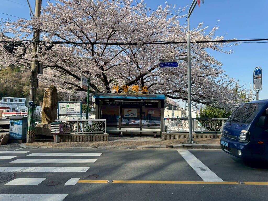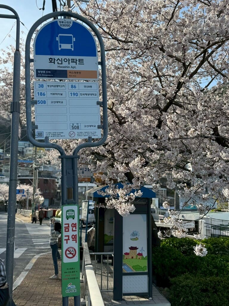 Hwashin公寓車站的櫻花樹很大, 加上公車站上方的「사랑해요」- 我愛你的韓文字。就讓這個公車站 ,因為櫻花 變得更為浪漫💕。