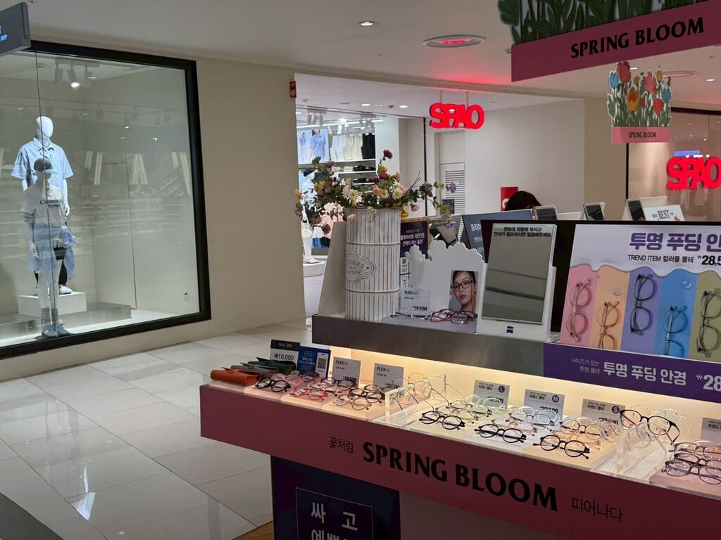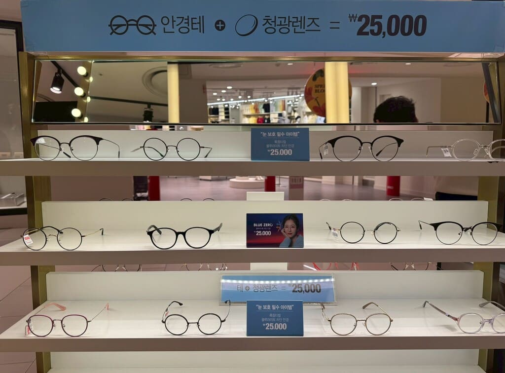 南浦洞樂天百貨三樓( 有噴泉的3樓,旁邊有SPAO服飾店) 인경은얼이다 現在有特價活動區!鏡框+ 抗藍光平光鏡片只要25000 韓幣600 台幣不到。如果要配有度數的,約加價40000 韓元,約台幣950。