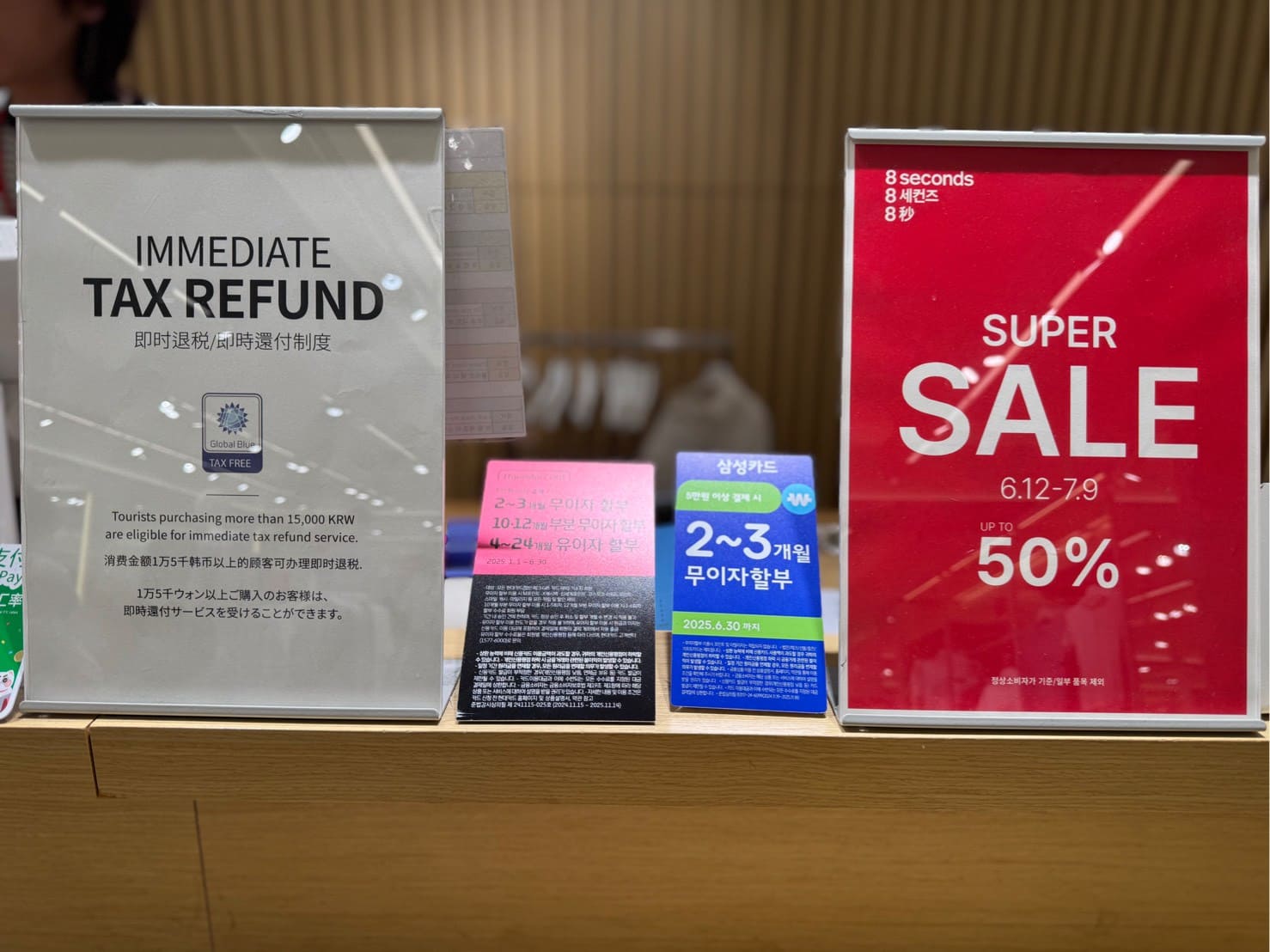 陪 釜山好友的女兒去結帳, 看到「即刻退稅」的字樣, 老花眼突然眼睛一亮, 然後又看到了紅色的看板,寫著「 SUPER SALE 」….. 立馬問了工作人員,可不可以拍照?得到了允許後,就想趕快跟各位分享。 這一次的折扣期間為6月12號到7月9號。 最高可享5折優惠。