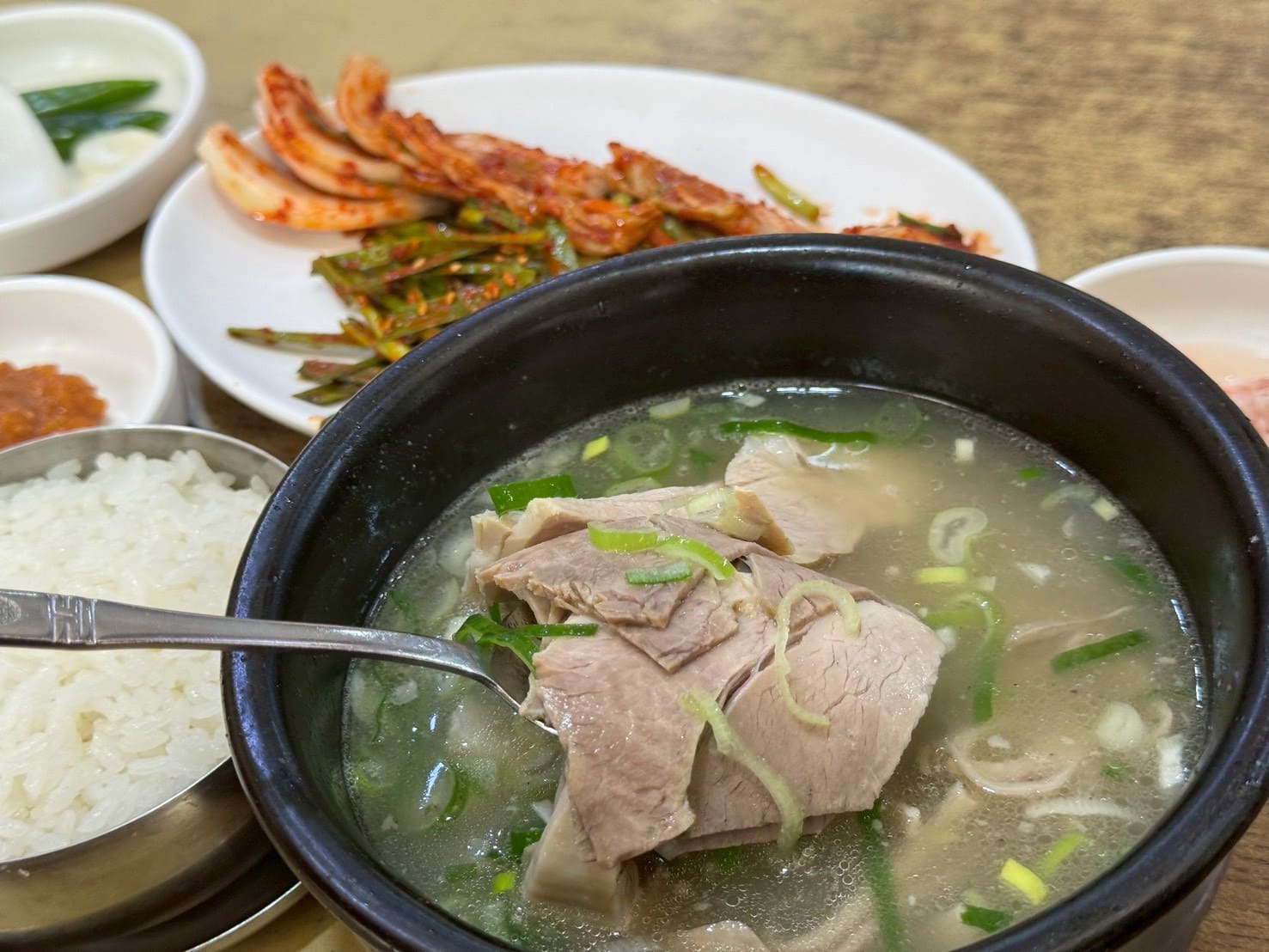 我點的是豬肉+內臟各半的湯飯,豬肉不油膩、湯頭輕甜,內臟處理得非常乾淨,完全沒有腥味。再搭配老闆特製的爽脆泡菜,真的是完美組合!